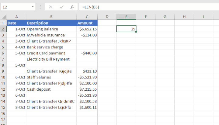 This formula counts the number of letters, spaces and special characters in the string “M/vehicle Insurance” and returns a value of 19.