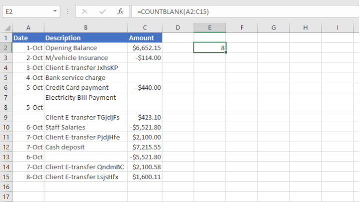 The COUNTBLANK formula in cell E2 checks the range A2 to C15 and determines that eight cells contain no data.