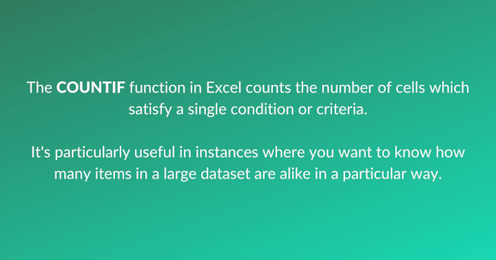 The COUNTIF function in Excel counts the number of cells which satisfy a single condition or criteria. It’s useful to learn how to use the COUNTIF Excel function because we often want to know how many items in a large dataset are alike in a particular way. The COUNTIF function is usually a quick, go-to solution.