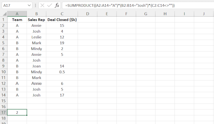 =SUMPRODUCT((A2:A14="A")*(B2:B14="Josh")*(C2:C14<>""))