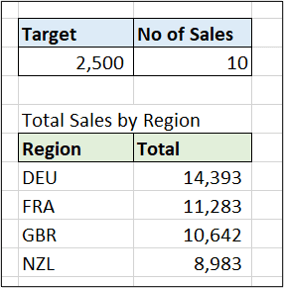 We need to return the total sales for each region, and also calculate how many sales met or exceeded the target value of 2,500.