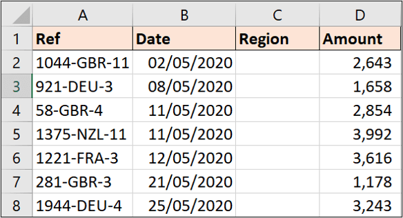 The first task is to write a formula in column C that extracts the region code from the ‘Ref’ column.