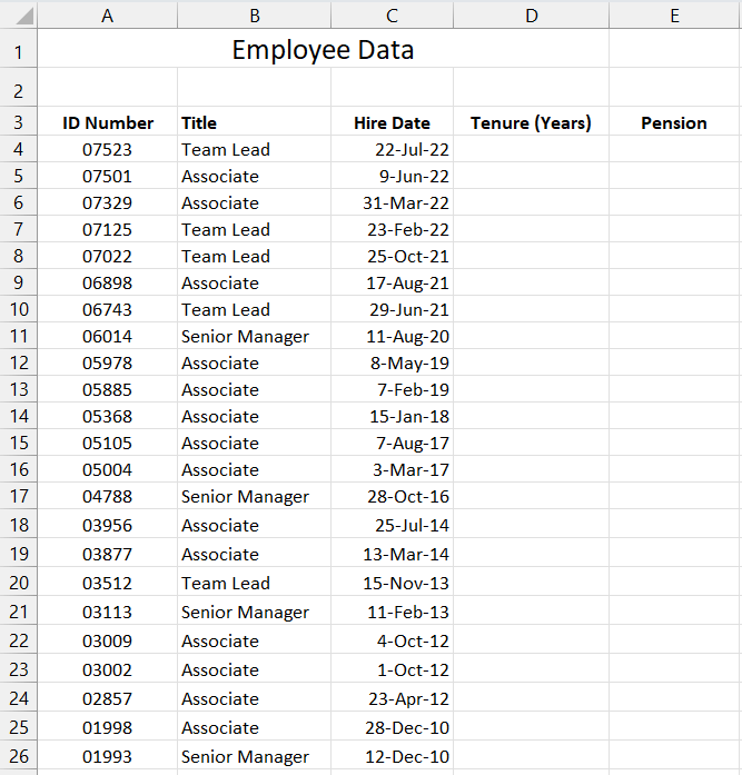 - Calculate each employee's number of years with the company.