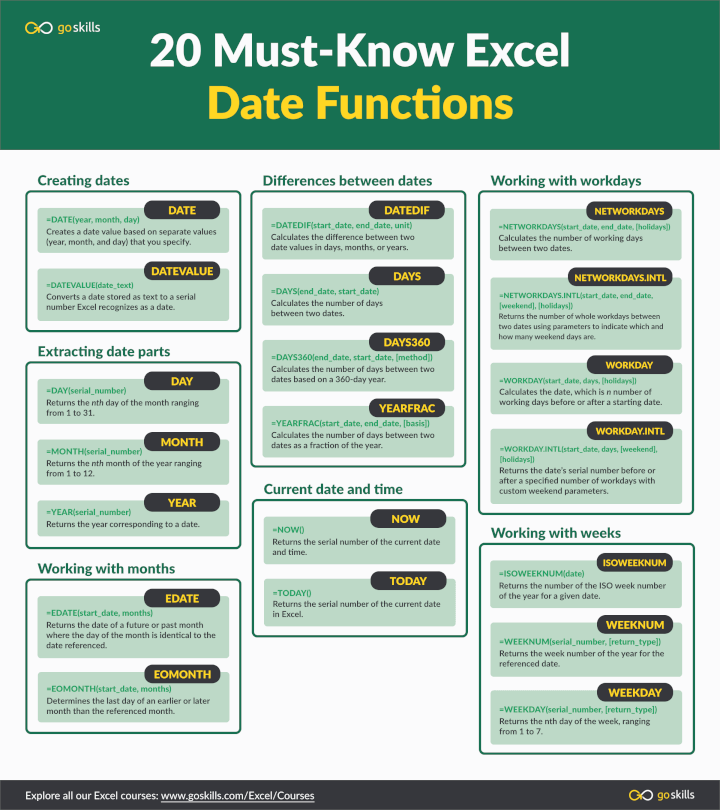 This video covers the top six functions. Below we cover 20 Excel date functions.