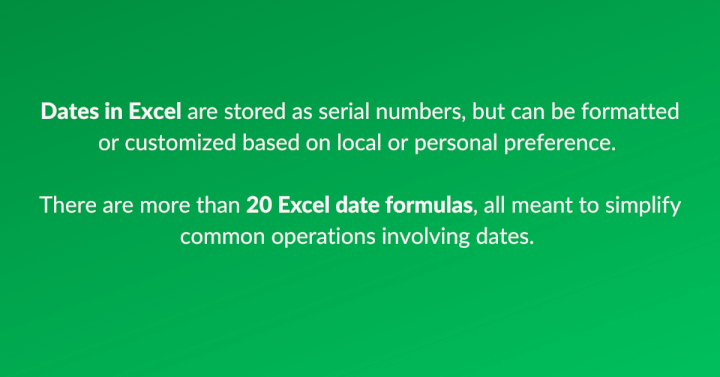 There are more than 20 Excel date functions, all meant to simplify common operations involving dates.