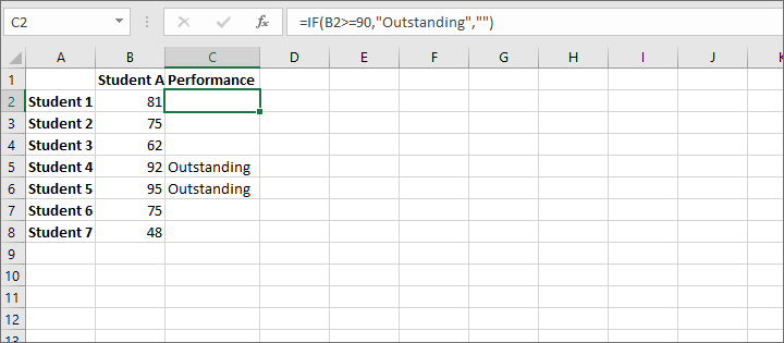 | How to use IF in Excel | =IF(A2>=90, "Outstanding", "") will display the text "Outstanding" if the value in cell A2 is greater than or equal to 90. Otherwise, a blank will be displayed. |