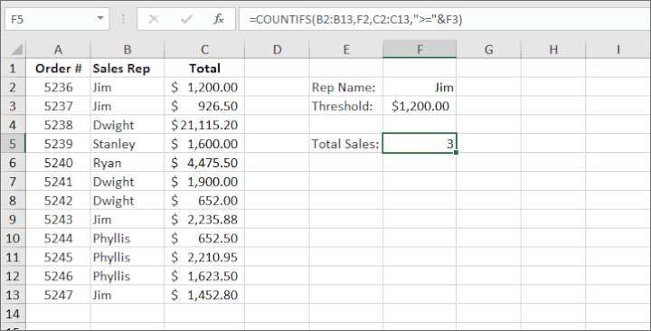 | How to use COUNTIFS in Excel | See example below. The formula only counts the number of sales made by Jim where the value was greater than or equal to $1200. |