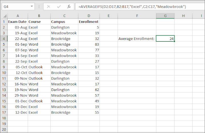 | How to use AVERAGEIFS in Excel | See example below. The formula below calculates the average number of enrollments for Excel at the Meadowbrook campus. |