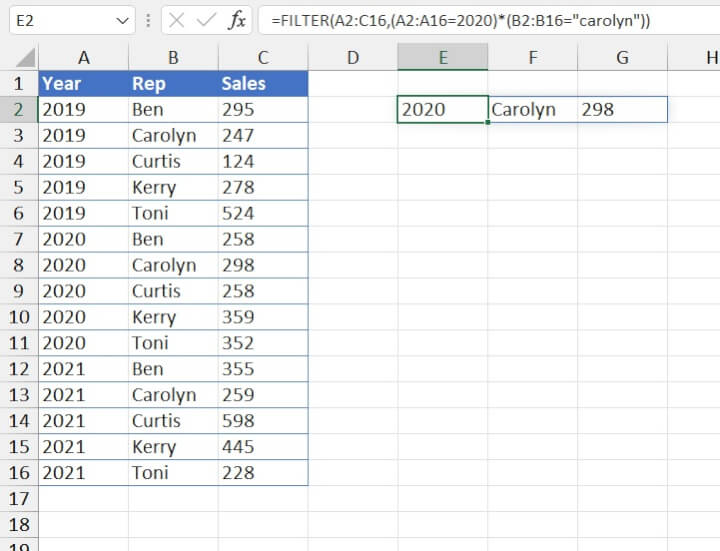 =FILTER(B2:C16,(A2:A16=2020)*(B2:B16="carolyn"))