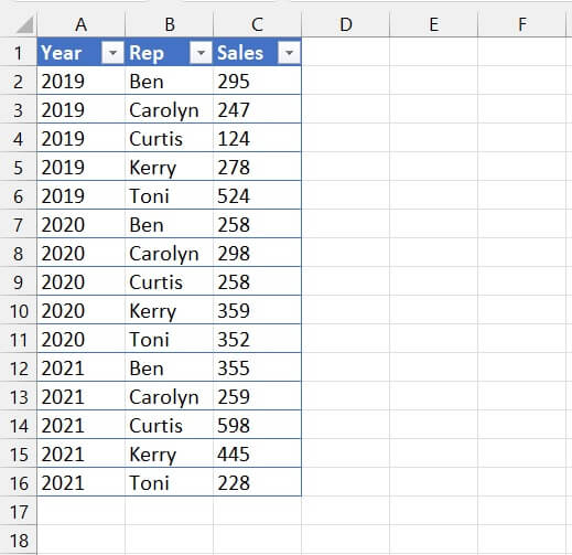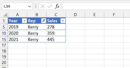 So if we applied auto-filters to find records for the year “2021” and then another filter for sales less than 200, we would get no results because all sales in 2021 were greater than 200. Therefore, filtering across multiple categories uses AND logic (must satisfy all criteria).