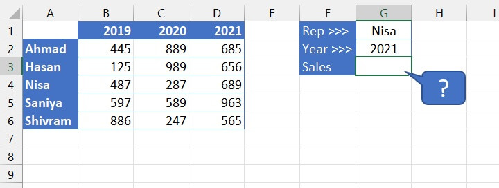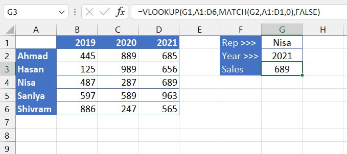 =VLOOKUP(G1,A1:D6,MATCH(G2,A1:D1,0),FALSE)
