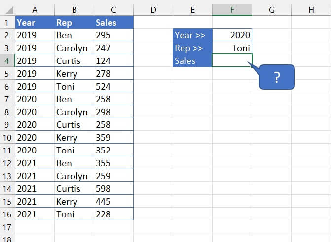 The above formula looks for instances where the value in column A is equal to 2020, AND the same row carries the value “Carolyn” in column B.