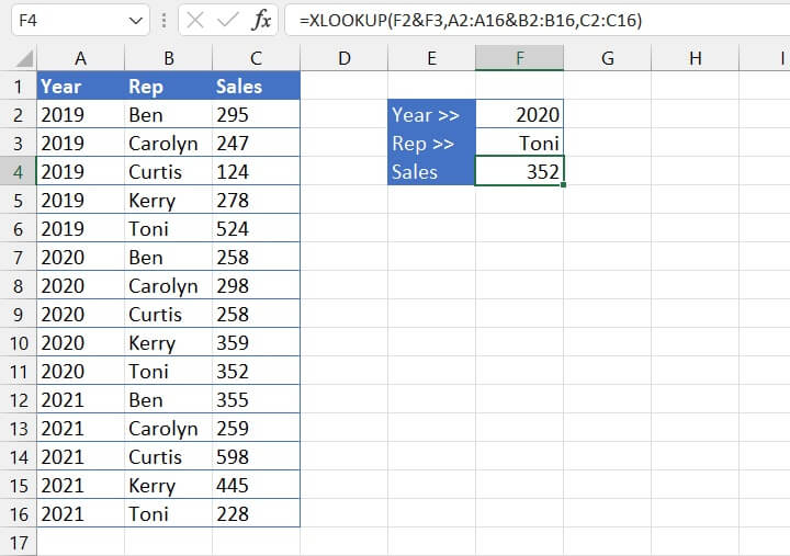 =XLOOKUP(F2&F3, A2:A16&B2:B16, C2:C16)