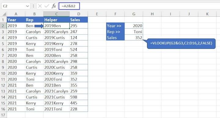 - In a helper column, use the ampersand (&), also known as the concatenation operator, to turn multiple values into a single string.