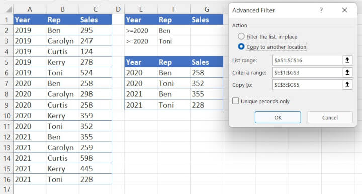 Like the FILTER function, advanced filters also allow you to match multiple criteria in Excel and return multiple results. The main thing to remember when entering criteria with this method is that for AND (must satisfy all) conditions, the criteria should be placed in the same row, but for OR (satisfy any) conditions, they should be placed in separate rows.