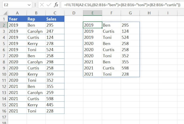 The formula above looks for any instances where column B matches either “Ben”, “Toni”, or “Carolyn” and returns all the results.