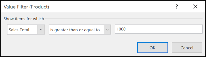 The following Pivot Table has two filters applied. The Pivot Table values are filtered to only show products where total sales are greater than or equal to £1,000. And there is a report filter applied to show results for the region of ‘India’ only.