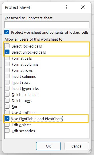 - In the Protect Sheet dialog box, uncheck “Select locked cells”
