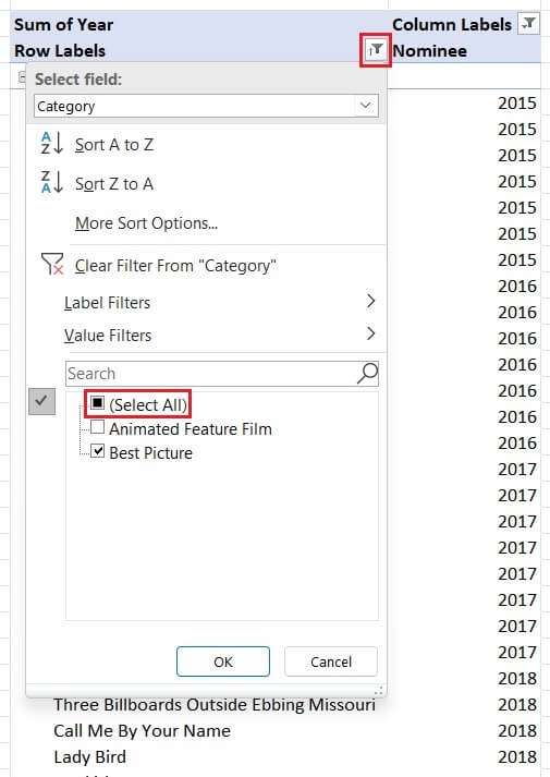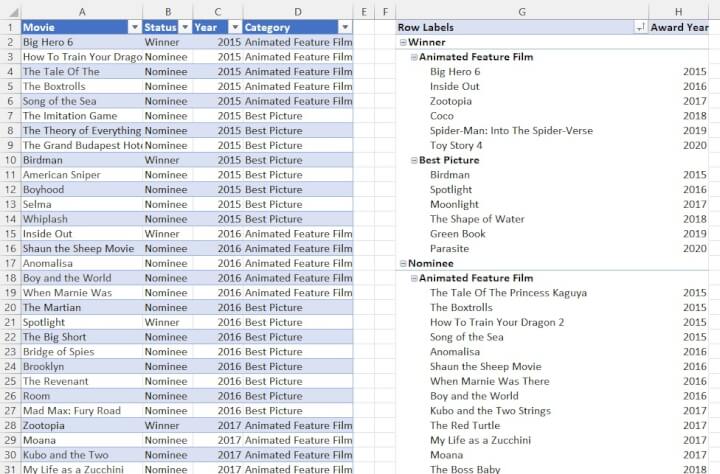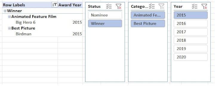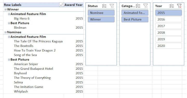 Let’s see what makes slicers so great by adding one to a pivot table that summarizes a six-year list of nominees and winners in two film categories.