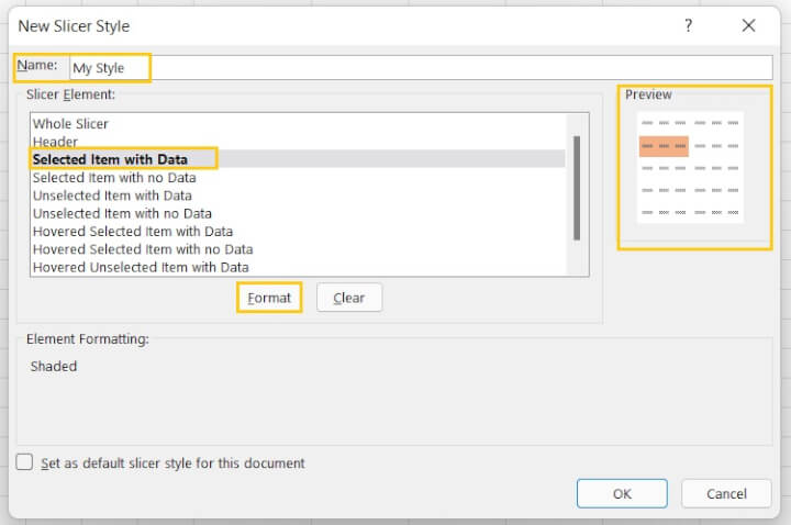 Below, select a slicer element then click the Format button to control how that element will appear when your new slicer style is applied. You can format as many elements as you like. A Preview will be shown in the window before the slicer style is created.