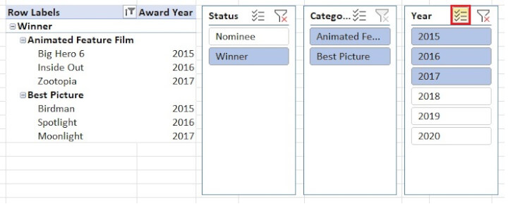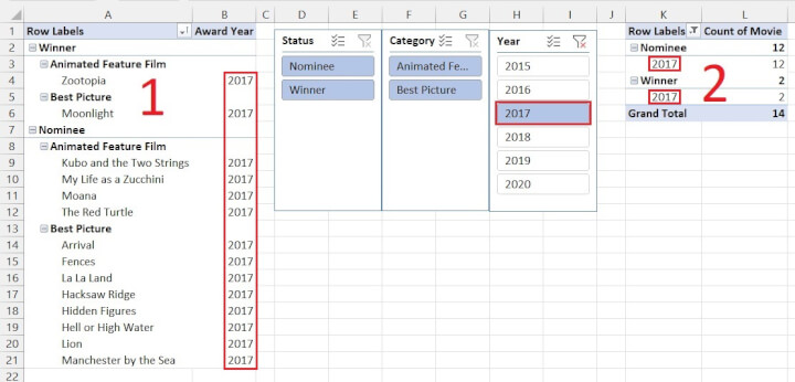 In the example above, selecting the year 2017 shows the names of the nominees and winners for that year in the first pivot table, while simultaneously showing the number of nominees and winners for that same year in the second pivot table.