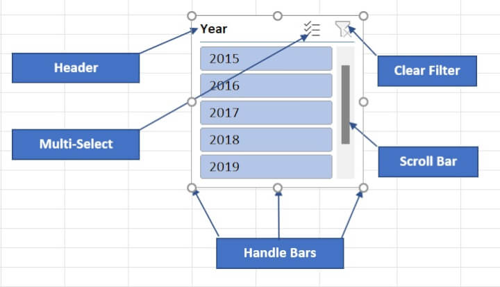 - Handle Bars: These eight handles allow you to resize or drag and drop the slicer as you would do with any graphic object.