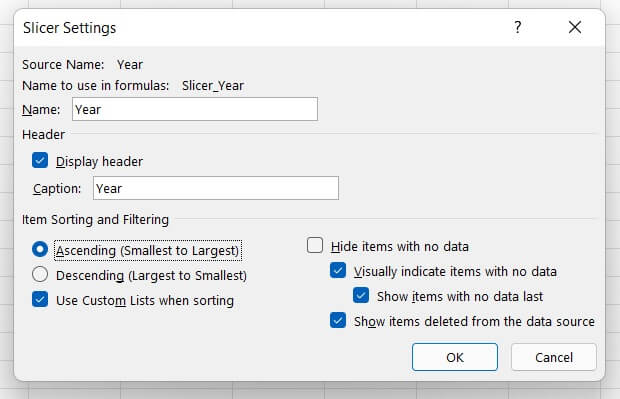 From here you can change the displayed header name, the sort order of the slicer buttons, and how to represent elements that have no data.