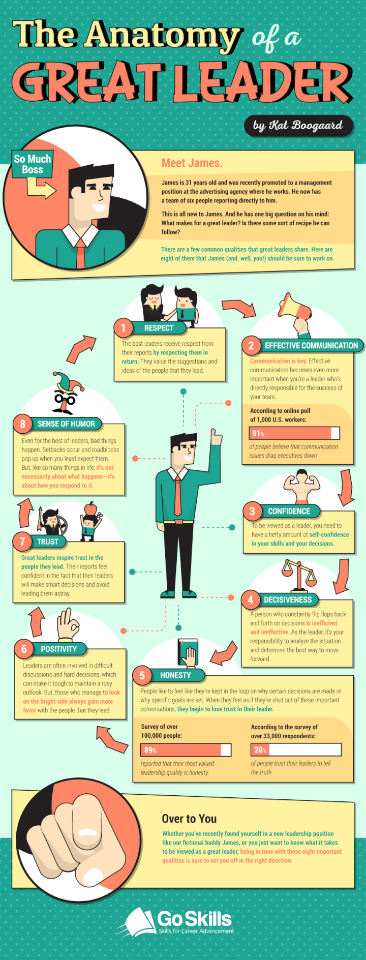 Not exactly—it’s different for everybody. But, with that said, there are a few common qualities that great leaders share. Here are eight of them that James (and, well, you!) should be sure to work on.