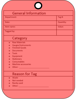 If you follow the 5S system, this is where you’ll be introduced to red tags. A variety of different styles are available from any 5S store online, which can look something like the following: