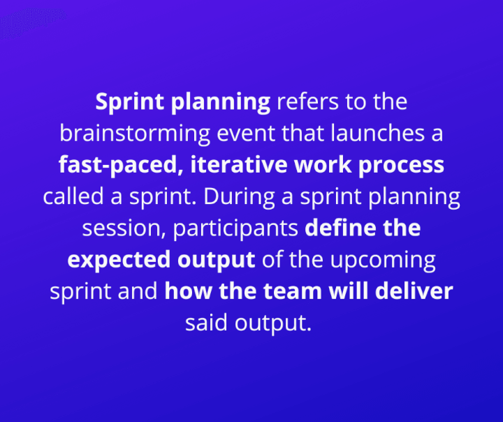 Sprint planning refers to the brainstorming event that launches a fast-paced, iterative work process called a sprint. During a sprint planning session, participants define the expected output of the upcoming sprint and how the team will deliver said output. Sprint planning provides guidance and clarity on how component tasks relevant to the predicted outcome might be specified, delegated, and prioritized.