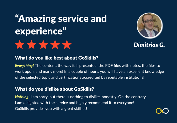 “Everything! The content, the way it is presented, the PDF files with notes, the files to work upon, and many more! In a couple of hours, you will have an excellent knowledge of the selected topics and certifications accredited by reputable institutions,” says Dimitrios G, one of our learners.