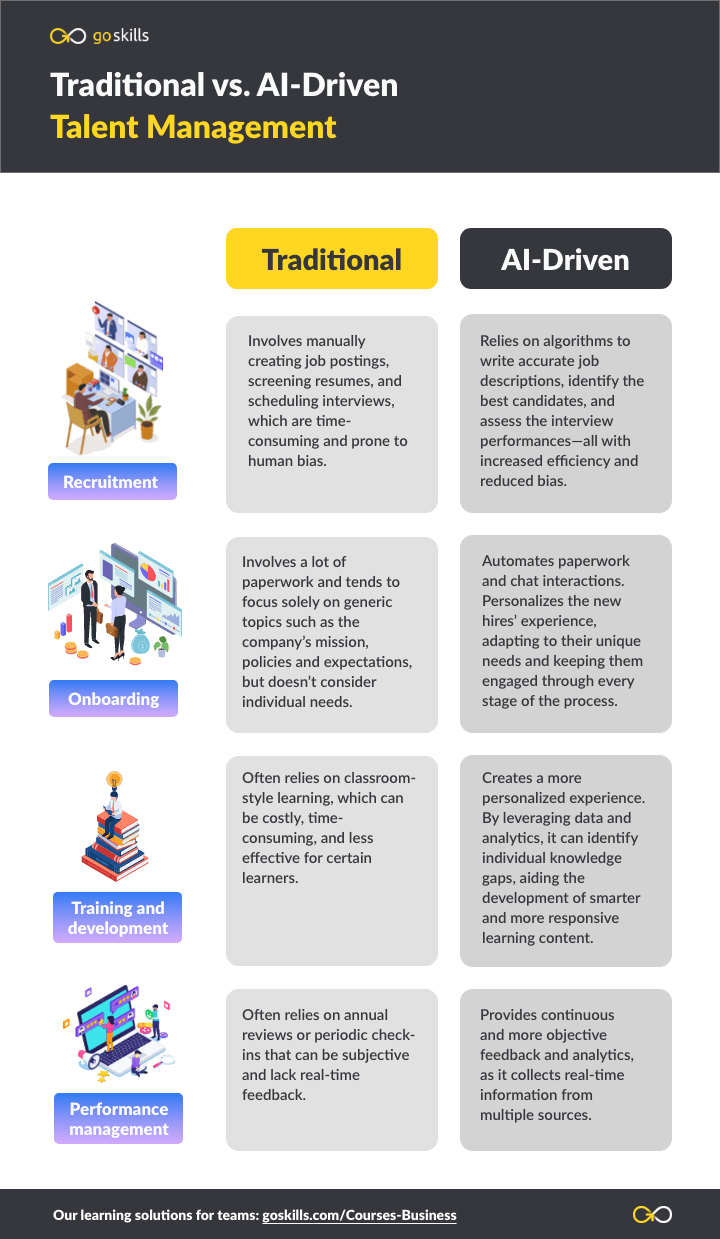 When AI is used in the hiring process, it makes for a smooth transition to AI used in the training process, and employee training does not stop once onboarding has been completed. Employee training should continue throughout the tenure of the employee, facilitated by the use of a learning management system (LMS).