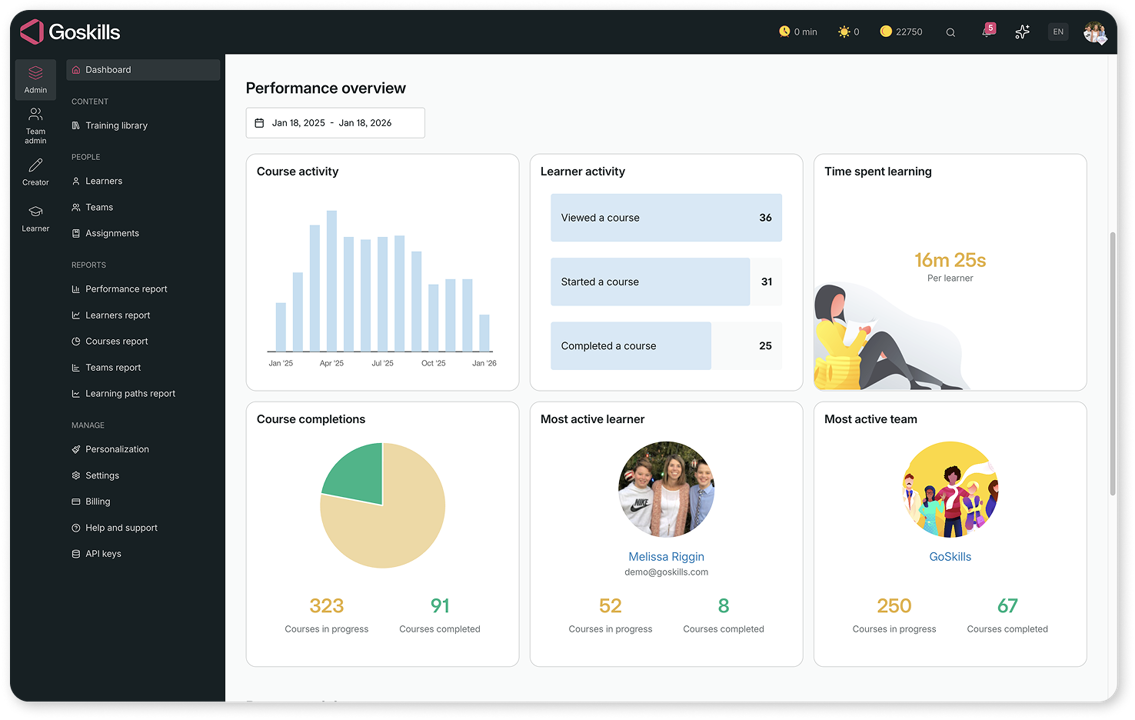 GoSkills LMS is a budget-friendly, easy-to-use learning management system for upskilling teams of all sizes. The platform comes with a built-in course library and the ability to create or upload your own courses.